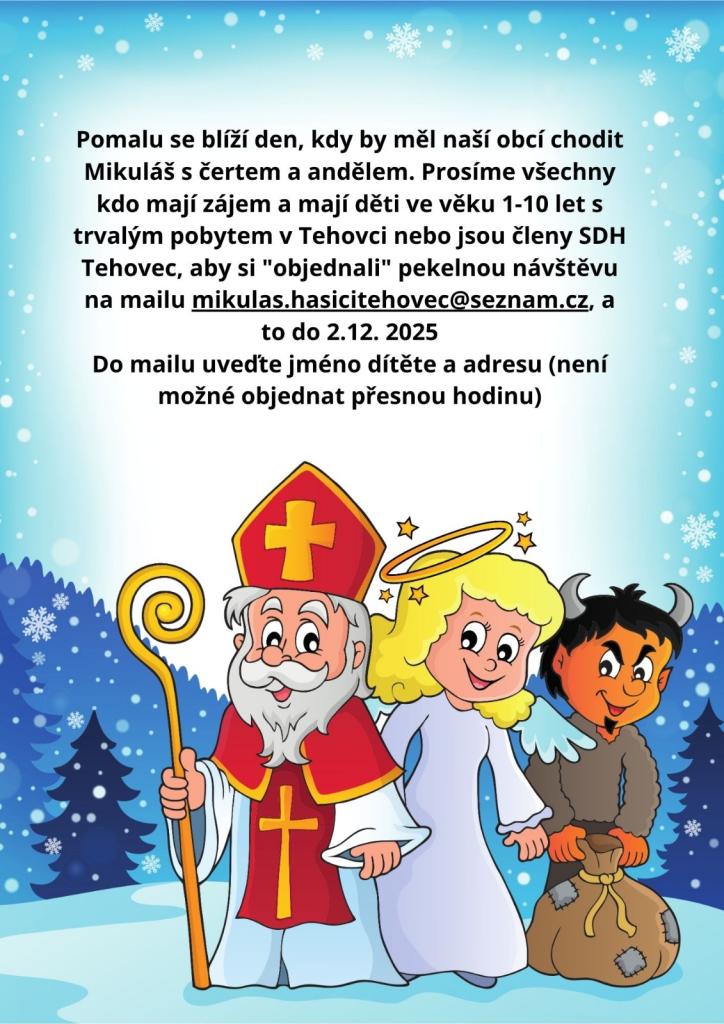 V Tehovci se blíží tradiční Mikulášská nadílka, kterou pořádá SDH Tehovec. Prosíme všechny zájemce s dětmi ve věku 1-10 let, aby si objednali pekelnou návštěvu. Mikuláš, čert a anděl navštíví vaši domácnost a potěší vaše děti. Objednávku je nutné zaslat na uvedený e-mail do 2. prosince 2025.