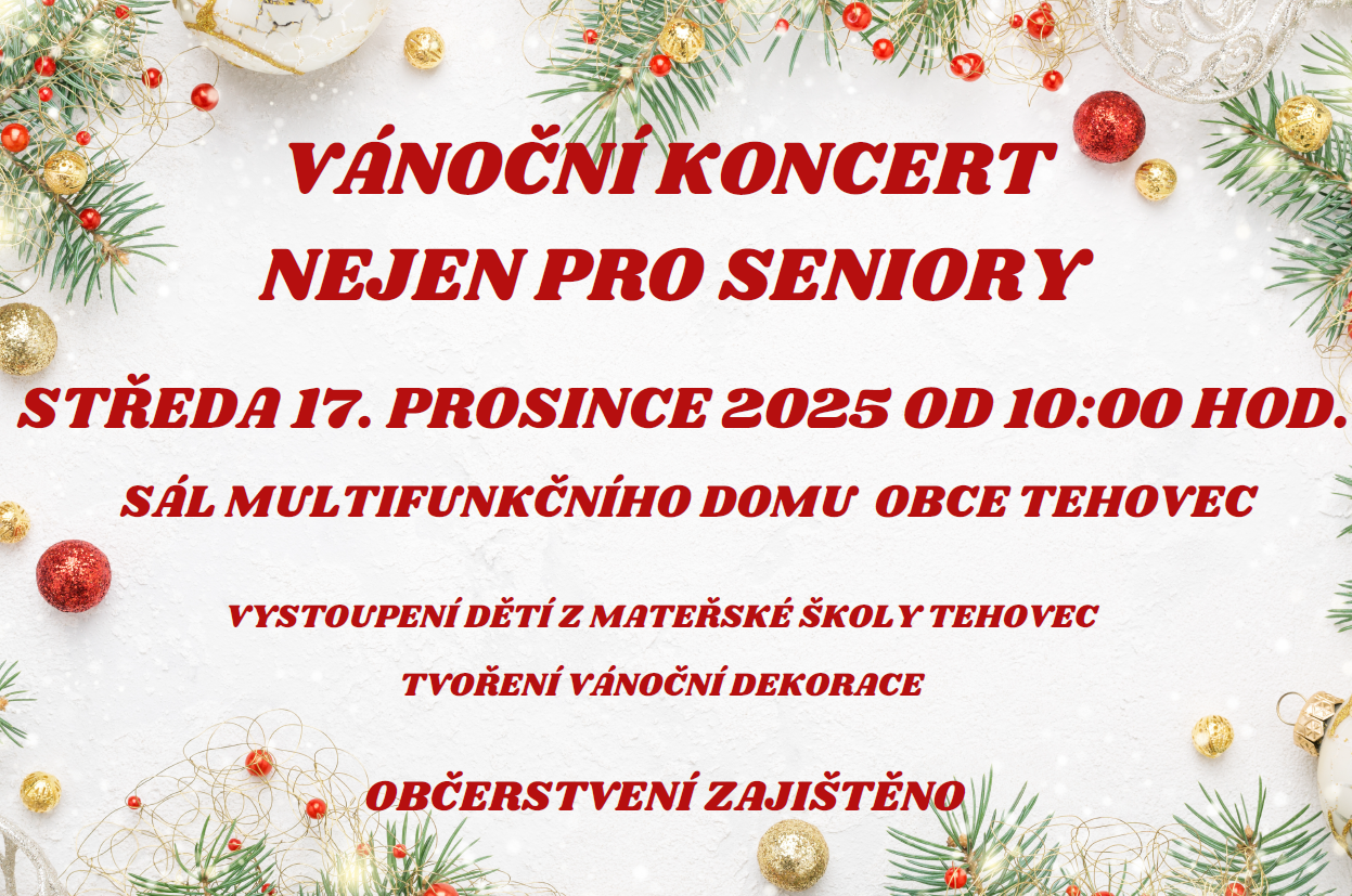 Vánoční koncert je určen nejen seniorům, ale i dalším obyvatelům Tehovce. Vystoupí na něm děti z mateřské školy. Po koncertu si návštěvníci za pomoci dětí vyrobí jednoduchou vánoční dekoraci. Občerstvení zajištěno.